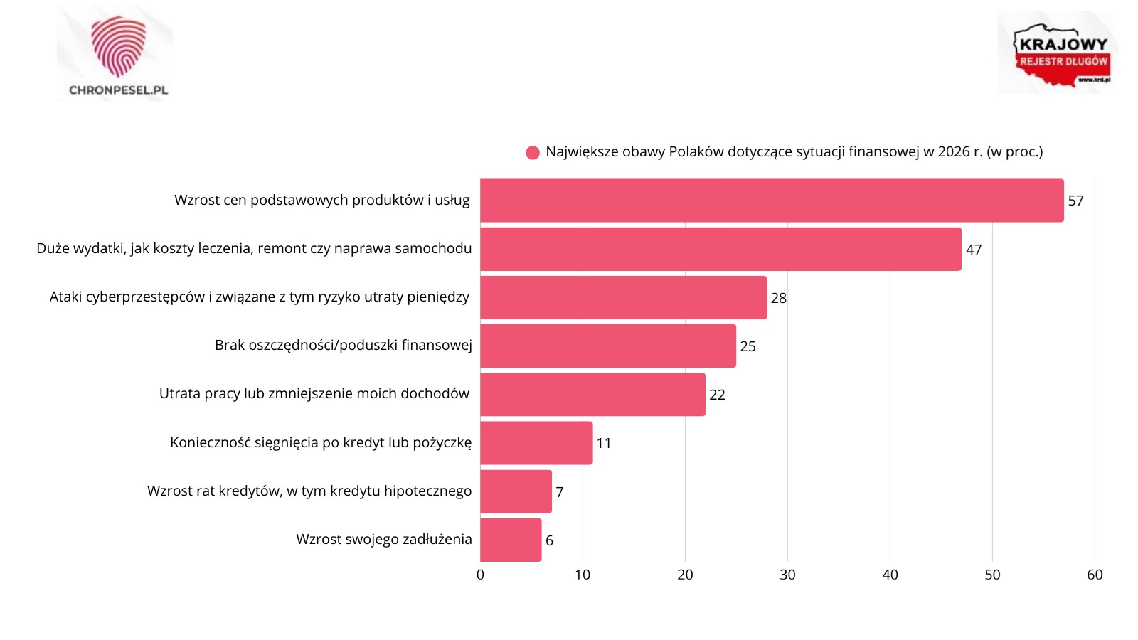 Zmiana ta występuje w nastrojach cyfrowych. Jak wynika z badań „Portfele Polaków u progu 2026 roku: oszczędności i zagrożenia”, przeprowadzonego na platformie serwisu ChronPESEL.pl i Krajowego Rejestru Długów, 28 proc. respondentów, które są podłączone do źródła cyberoszustw jako jedno z gniazd dla swoich finansów. To więcej niż zagrożenie przed zabezpieczeniem oszczędności (25 proc.) czy zastosowanie lub zastosowanie opcjonalne (22 proc.). Wyżej na liście lęków występuje jedynie inflacja (57 proc.) oraz niespodziewane duże wydatki, takie jak koszty leczenia czy remontu (47 proc.).