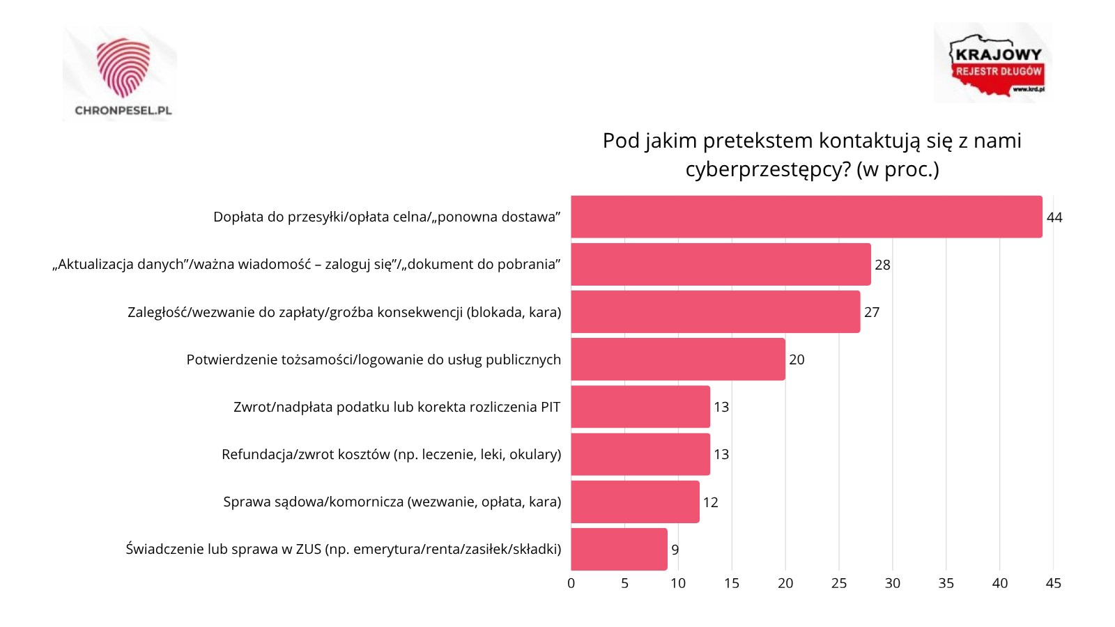 Na tym jednak katalog rzekomych powodów do kontaktu się nie kończy. Niemal co trzeci badany wskazuje, że oszuści próbują nakłonić go do działania pod pretekstem aktualizacji danych, ważnej wiadomości, zalogowania się lub pobrania dokumentu (28 proc.). Kolejne są komunikaty o zaległości, wezwaniu do zapłaty lub groźbie konsekwencji, takich jak blokada czy kara (27 proc.). Z kolei co piąty respondent zetknął się z próbą wyłudzenia związaną z potwierdzeniem tożsamości lub logowaniem do usług publicznych.